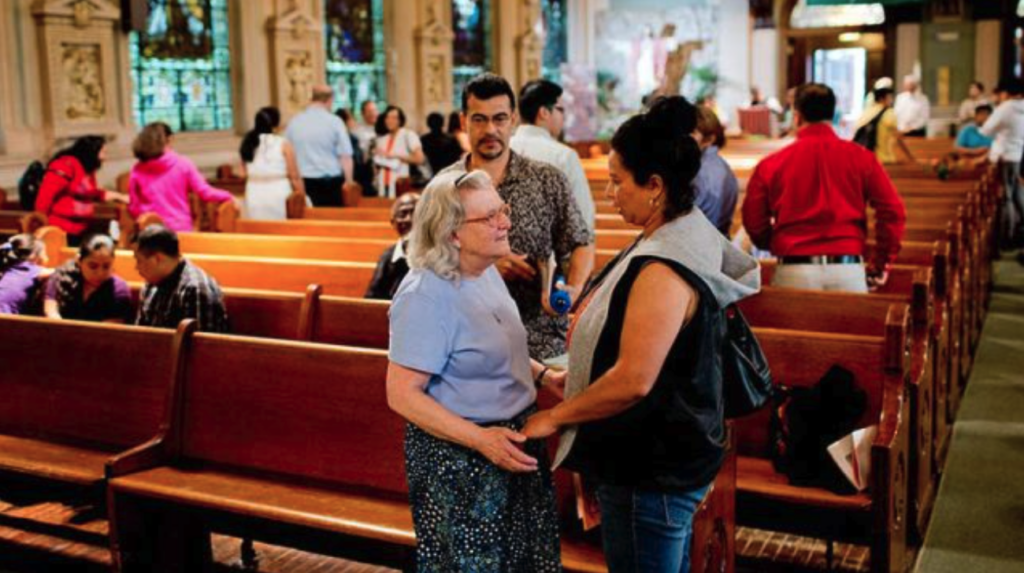 image: Patricia Pora, RSM, and a parishioner at Sacred Heart Church in Portland, Maine, talk after Mass